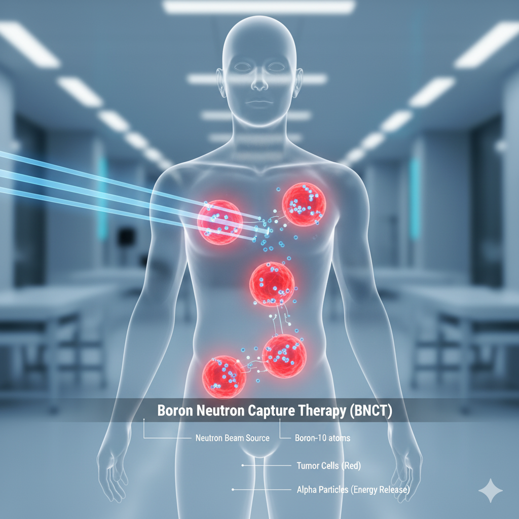 Xạ trị bắt Neutron (Boron Neutron Capture Therapy – BNCT) là liệu pháp “xạ trị trúng đích ở cấp độ tế bào”. Bệnh nhân được tiêm hợp chất chứa Boron-10, chất này tích tụ đặc hiệu trong tế bào ung thư. Chiếu chùm neutron nhiệt hoặc siêu nhiệt vào khối u và phản ứng hạt nhân xảy ra. Hạt Alpha và hạt nhân Lithium giật lùi có năng lượng cực lớn nhưng quãng chạy rất ngắn (< 10 µm – kích thước 1 tế bào), tiêu diệt tế bào ung thư từ bên trong mà không hại tế bào lành bên cạnh. Kết cấu cơ bản của Hệ thống BNCT: nguồn Neutron từ Lò phản ứng hạt nhân hoặc máy gia tốc proton bắn vào bia (thường là Lithium hoặc Beryllium) để tạo neutron; dược chất phóng xạ (Boron Carriers) BPA (Boronophenylalanine) và BSH (Sodium Borocaptate):